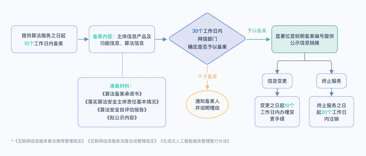 (1)算法备案:面向对象更为广泛,涵盖了各类算法服务‌,包括但不限于个性化推送类、排序精选类、检索过滤类、调度决策类以及生成合成类(含深度合成服务)等多种算法类型。无论是简单的推荐算法,还是复杂的决策算法,只要涉及算法服务的提供,均在算法备案的范畴之内。